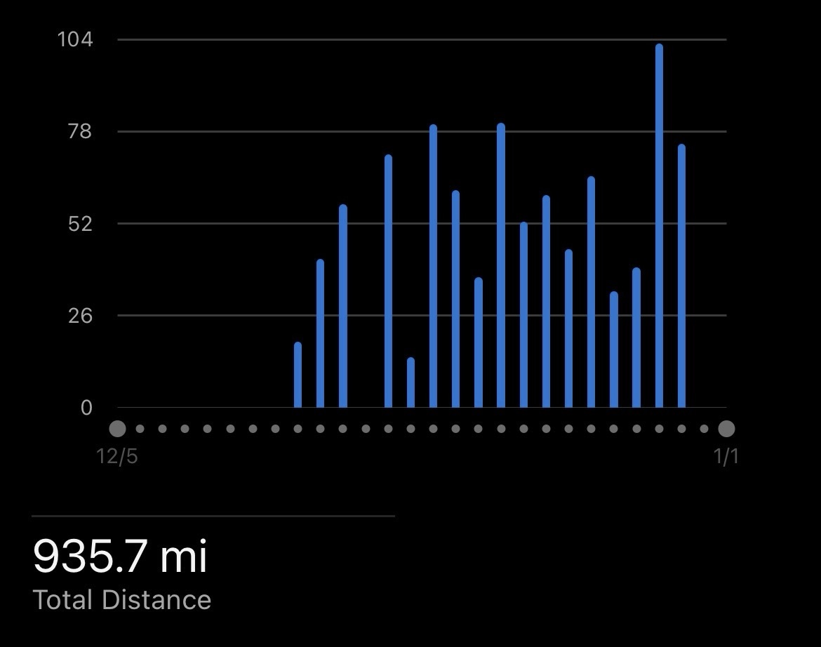 936 miles. 103 miles on the longest day. 14.3 miles on the shortest day. 52 miles on the average day.