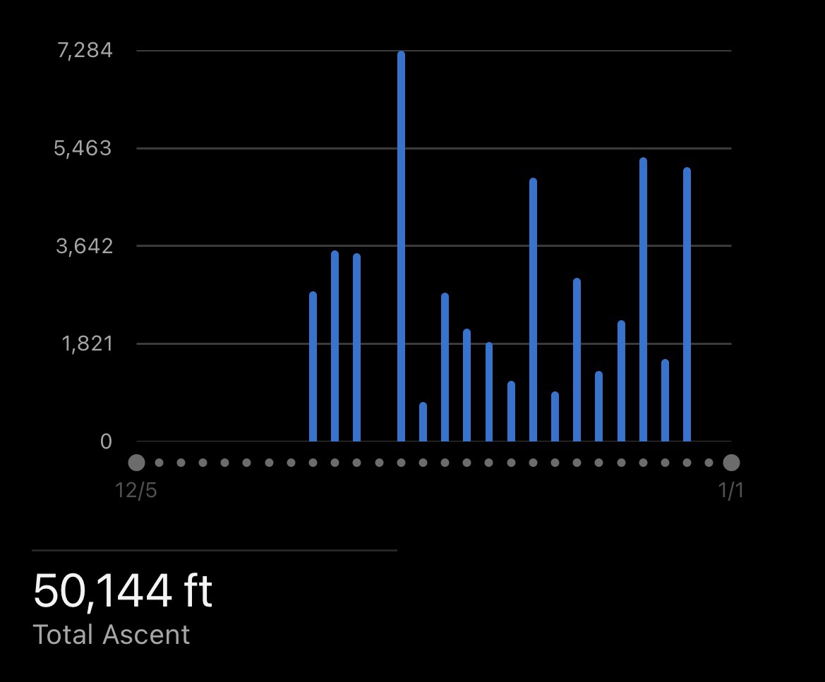50k feet of climbing. 7,280 feet on the climbiest day. 735 feet on the least climby day. 2,777 feet on the average day.