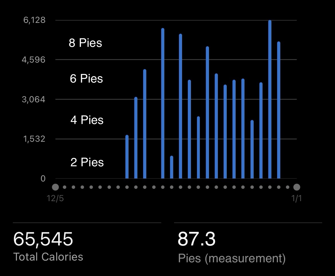 87 pies would have been necessary for a fully pie-powered trip (with 5 days of 7+ pies consumed). I only ate 17. I had 6 days with no pie consumed. Two days with 3 pies consumed. Two days with 2 pies consumed. Seven days with 1 pies consumed.
